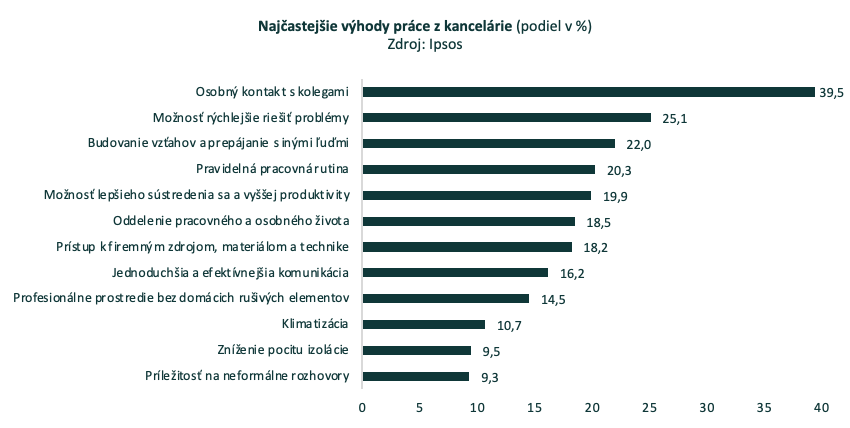 Medzi najčastejšie vnímané benefity práce v kancelárii patrí osobný kontakt s kolegami (39,5 %) a možnosť rýchlejšie riešiť problémy (25,1 %). Tieto dva faktory dominujú najmä vo vekovej skupine 45 – 65 rokov. Pre 22,0 % zamestnancov je výhodou budovanie vzťahov a prepájanie s inými ľuďmi, zatiaľ čo 20,3 % oceňuje pravidelnú pracovnú rutinu. Takmer pätina opýtaných (19,9 %) uvádza ako benefit lepšiu koncentráciu a vyššiu produktivitu. Generácia Z, teda mladí vo veku 18 – 24 rokov, vníma vo väčšej miere ako prínos najmä zníženie pocitu izolácie.