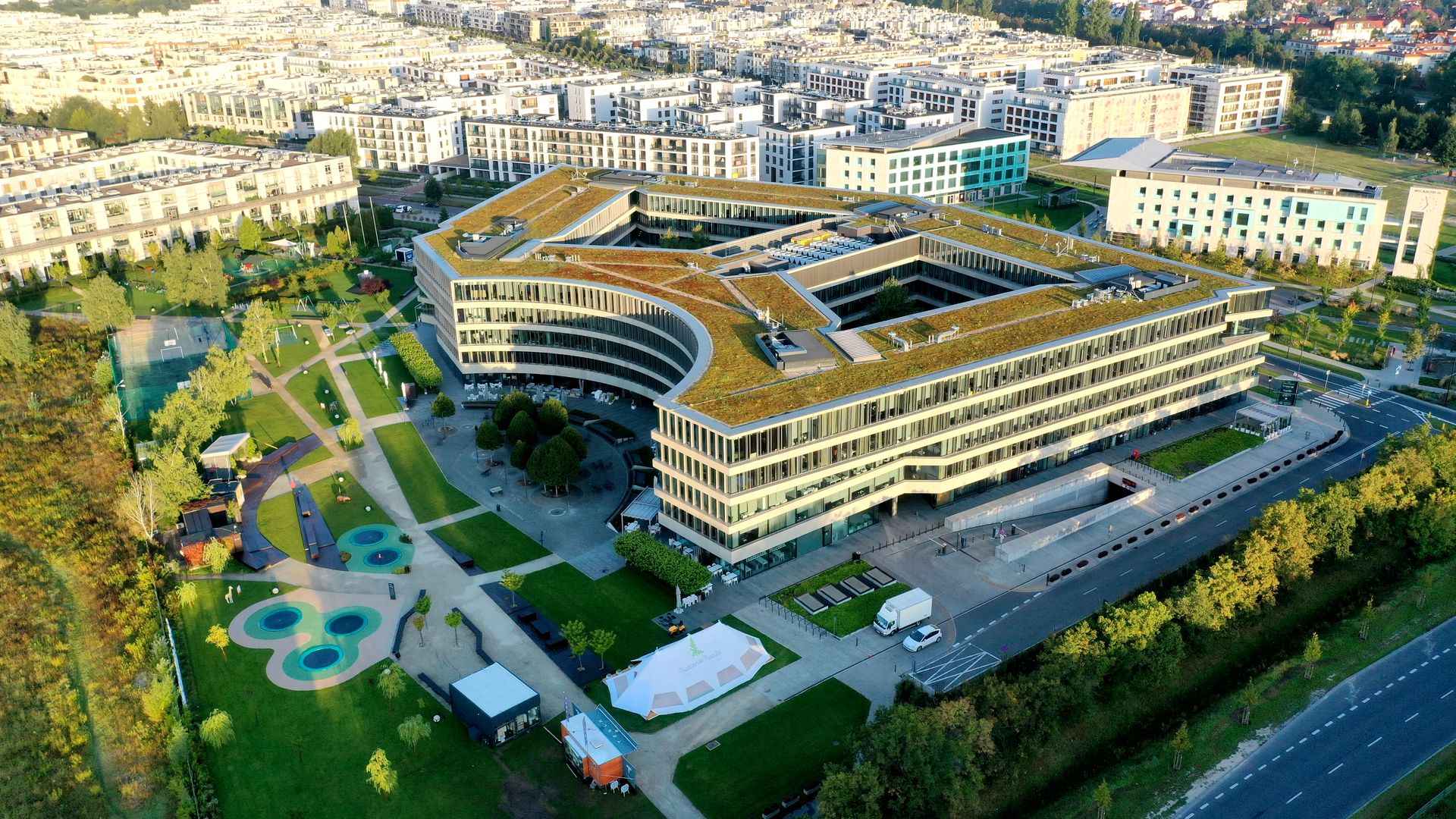 Royal Wilanów is a five-storey, Class A office building with a total lettable area of nearly 37,000 sqm, completed in 2015. The office component comprises approximately 25,000 sqm, while the remaining space is occupied by a retail zone offering healthcare services, restaurants, a grocery store, a kindergarten, a fitness club, and other amenities.